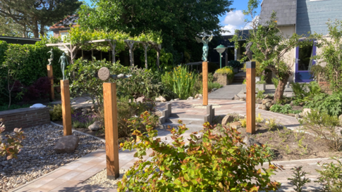 Verrassende tuin met beelden en verscheidenheid aan planten en leuke hoekjes. Opp. 545 m2.